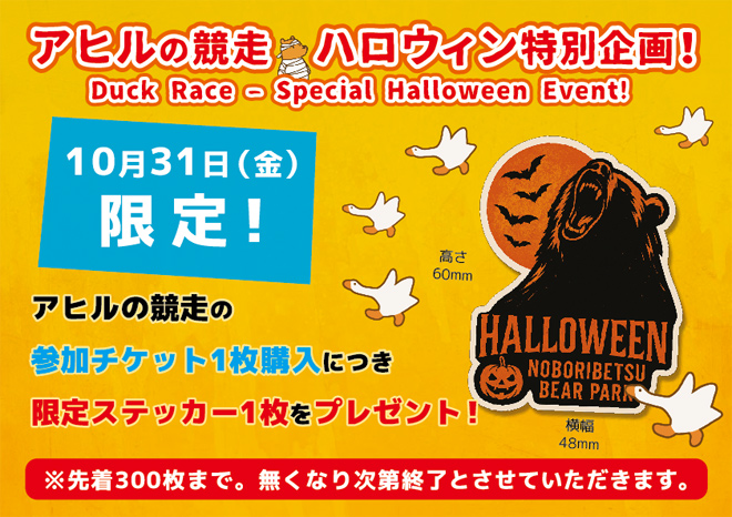 2025年10月31日(金)のみ限定で、アヒルの競走の参加チケット1枚購入につき、ハロウィン限定のオリジナルステッカーを1枚プレゼント!