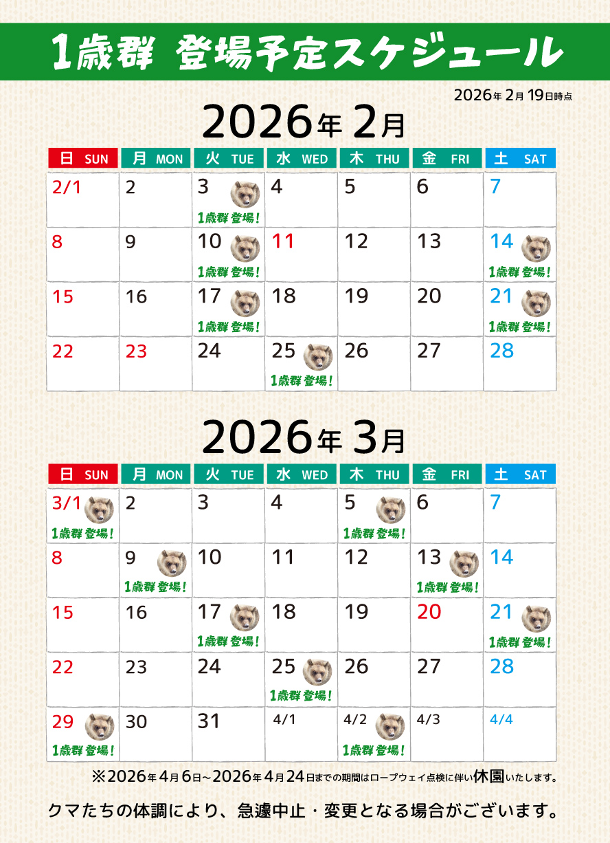※子グマたちの体調により、急遽中止となる場合がございます。