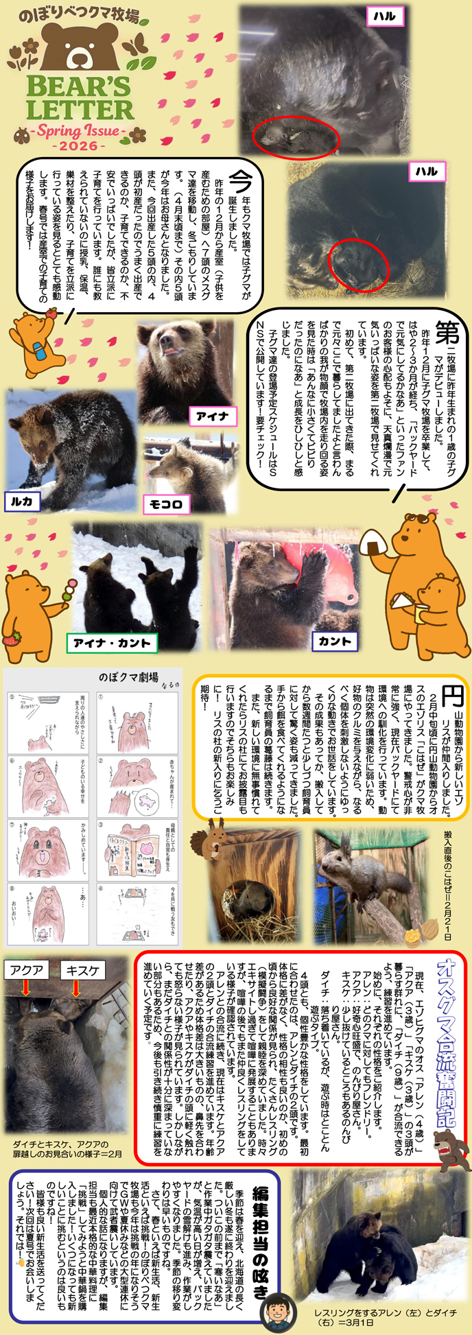 Bear’s Letter(旧 飼育員は見たべあ!) 2026年春号発行! 2026年4月1日 のぼりべつクマ牧場 (↑クリックでPDFをダウンロード) Bear’s Letterr(旧 飼育員は見たべあ!) 2026年春号を発行しました! なお、次回夏号の発行は2026年7月を予定しております。 PDFにてダウンロードできますので、ぜひご覧ください。 「Bear’s Letter」および「のぼりべつクマ牧場通信」一覧はこちら