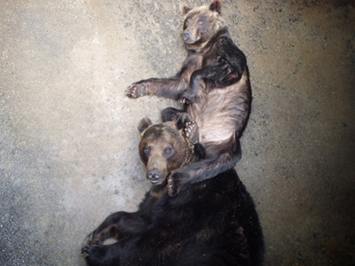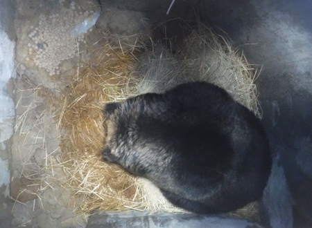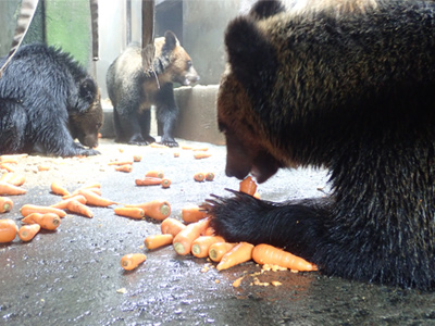 ※野生のヒグマは秋に脂肪をしっかり蓄え、冬には巣穴にこもる「冬ごもり(冬眠)」をします。のぼりべつクマ牧場でも12月になると、大きな複数頭用のお部屋から1頭用の巣穴のようなお部屋に移動して、暗くて静かなお部屋で過ごすクマもいます。この巣穴のような部屋は、野生での環境を模した構造になっており、飼育下でも冬眠をしやすくなっています
